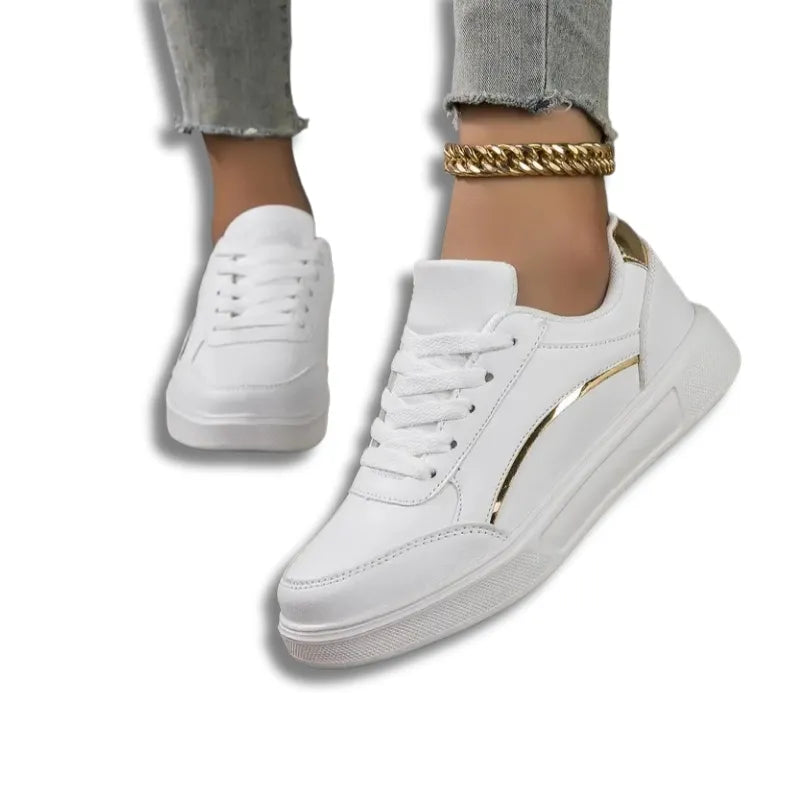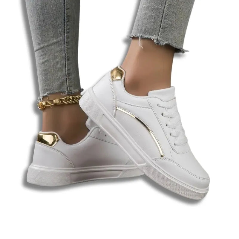 Les Sneakers Élégance Dorée incarnent la sophistication et la modernité. Avec leur finition blanche immaculée rehaussée d’accents dorés subtils, ces baskets ajoutent une touche de luxe à votre style quotidien. Parfaites pour compléter une tenue chic ou décontractée, elles sont idéales pour toutes les femmes à la recherche d’élégance dans leur garde-robe.