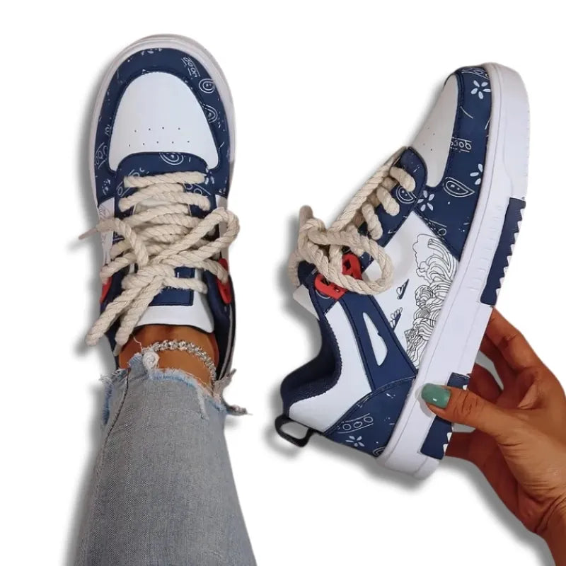 Les Baskets Urban Bandana se distinguent par leur motif bandana unique et leurs détails rouges saisissants. Ce mélange de bleu profond et de blanc, associé à des lacets en corde épaisse, crée un look urbain et authentique. Idéales pour celles qui cherchent à affirmer leur style avec audace, ces baskets sont parfaites pour les amateurs de streetwear.