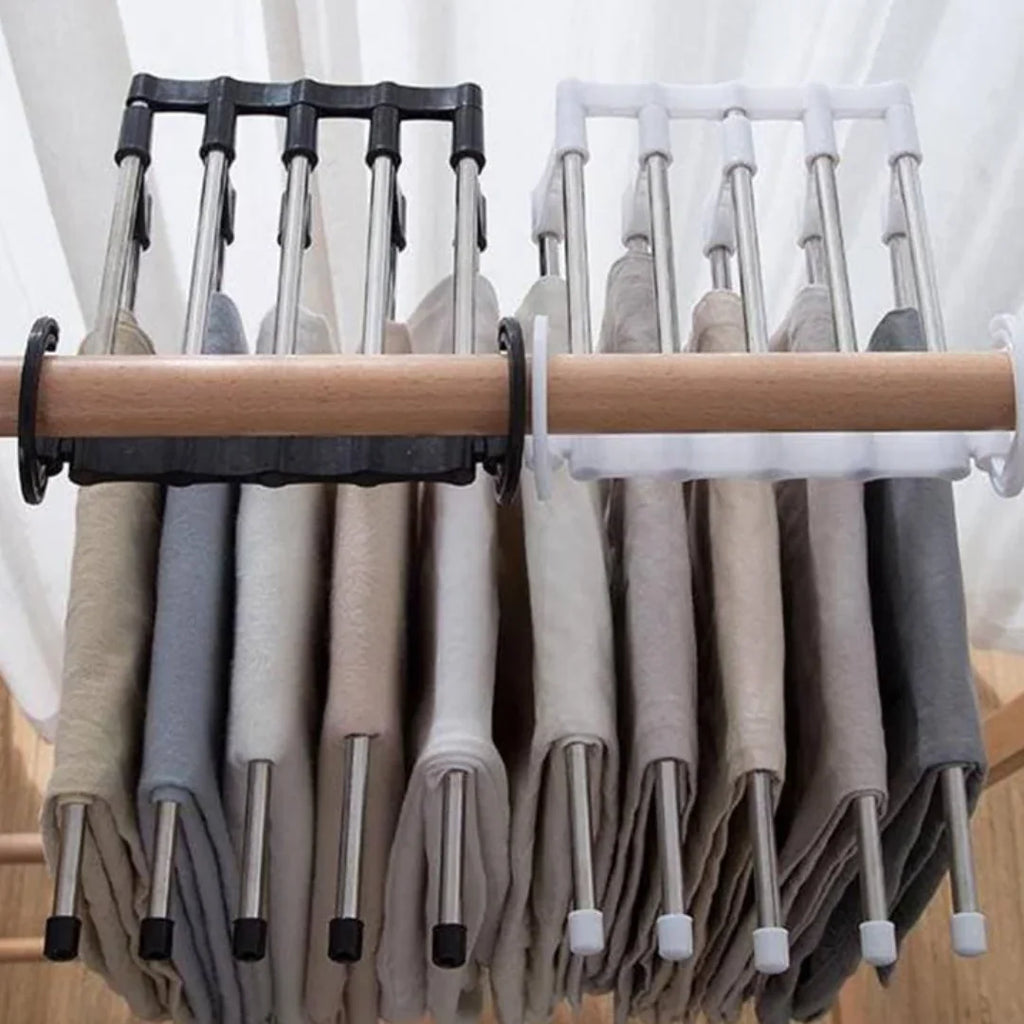 Optimisez l’espace de votre dressing avec ce cintre ingénieux capable de suspendre jusqu’à cinq pantalons à la fois. Compact, robuste et pliable, il s’adapte à tous les types de vêtements et à toutes les armoires. Parfait pour un rangement organisé, gain de place et sans plis, que ce soit à la maison ou en voyage.