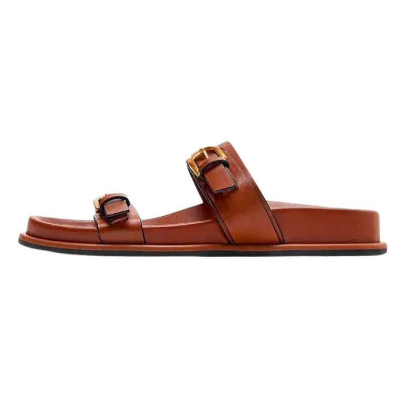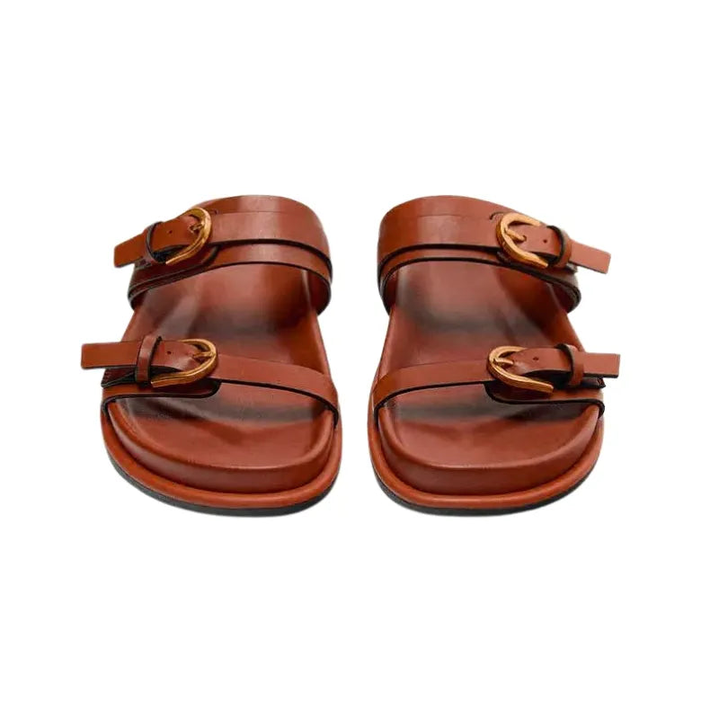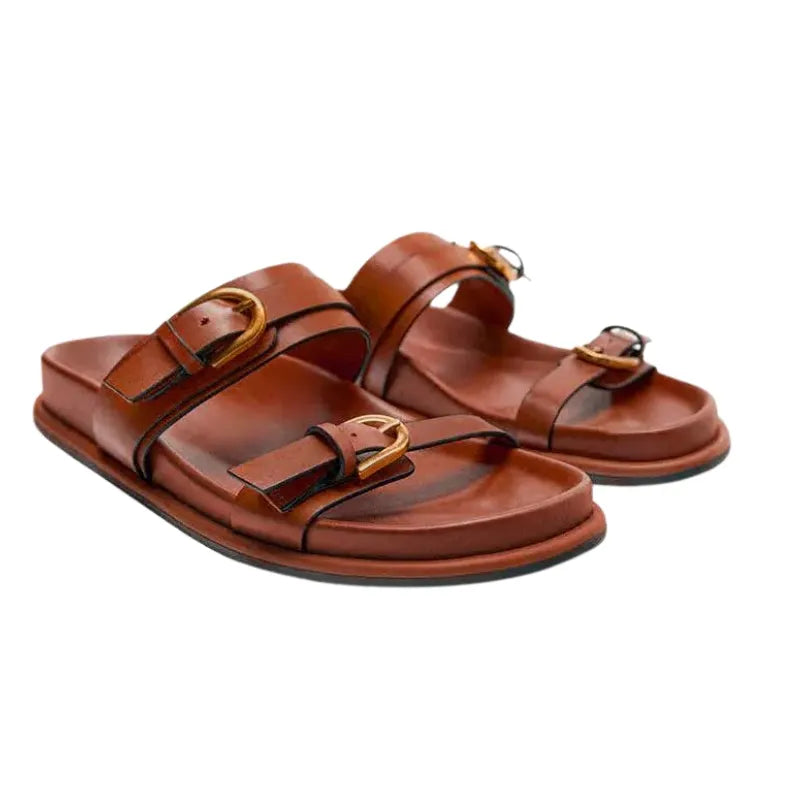 Les Sandales Élégance Urbane sont conçues pour ceux qui recherchent un mélange parfait de style sophistiqué et de confort. Avec leurs doubles brides en cuir marron et leurs boucles dorées, elles ajoutent une touche de raffinement à toutes vos tenues estivales. Idéales pour un look décontracté ou habillé, ces sandales sont l'accessoire incontournable de votre garde-robe.